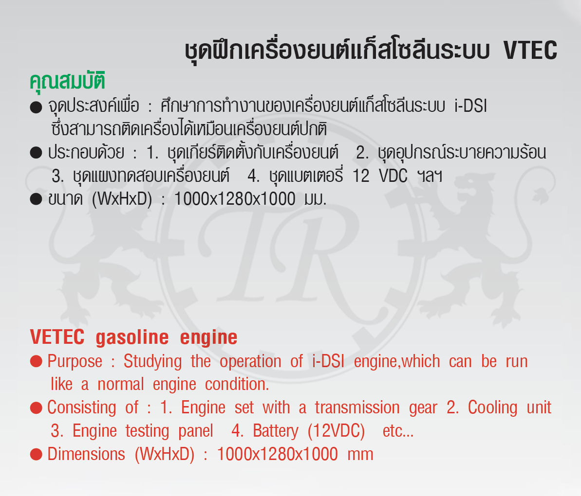 หน้าแรก » ชุดฝึก-ชุดลองระบบยานยนต์ (Education Automotive Training Systems) » ชุดฝึกเครื่องยนต์แก๊สโซลีนระบบ VTEC Model 0701-030