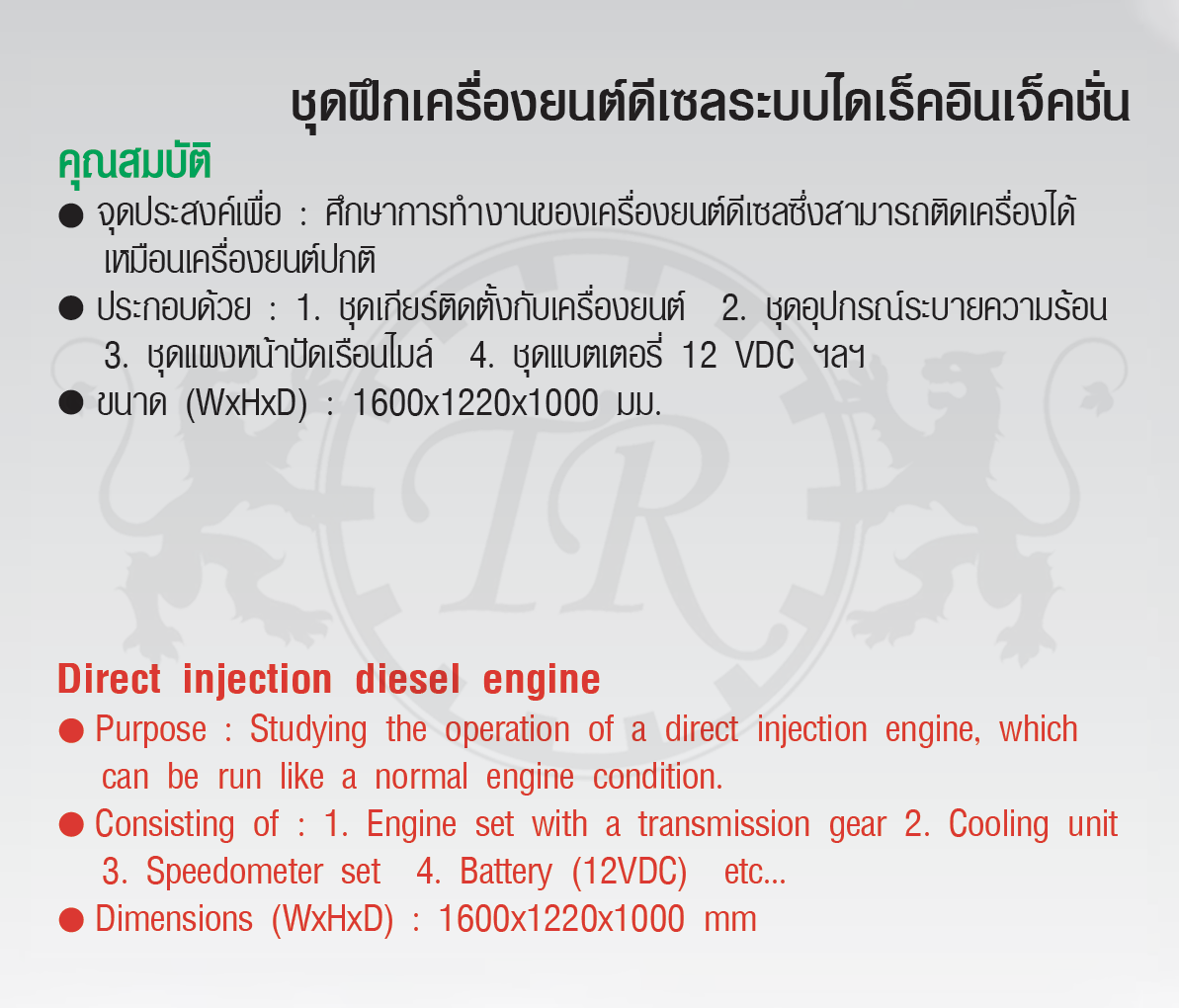 หน้าแรก » ชุดฝึก-ชุดลองระบบยานยนต์ (Education Automotive Training Systems) » ชุดฝึกเครื่องยนต์ดีเซลระบบไดเร็คอินเจ็คชั่น Model 0706-009